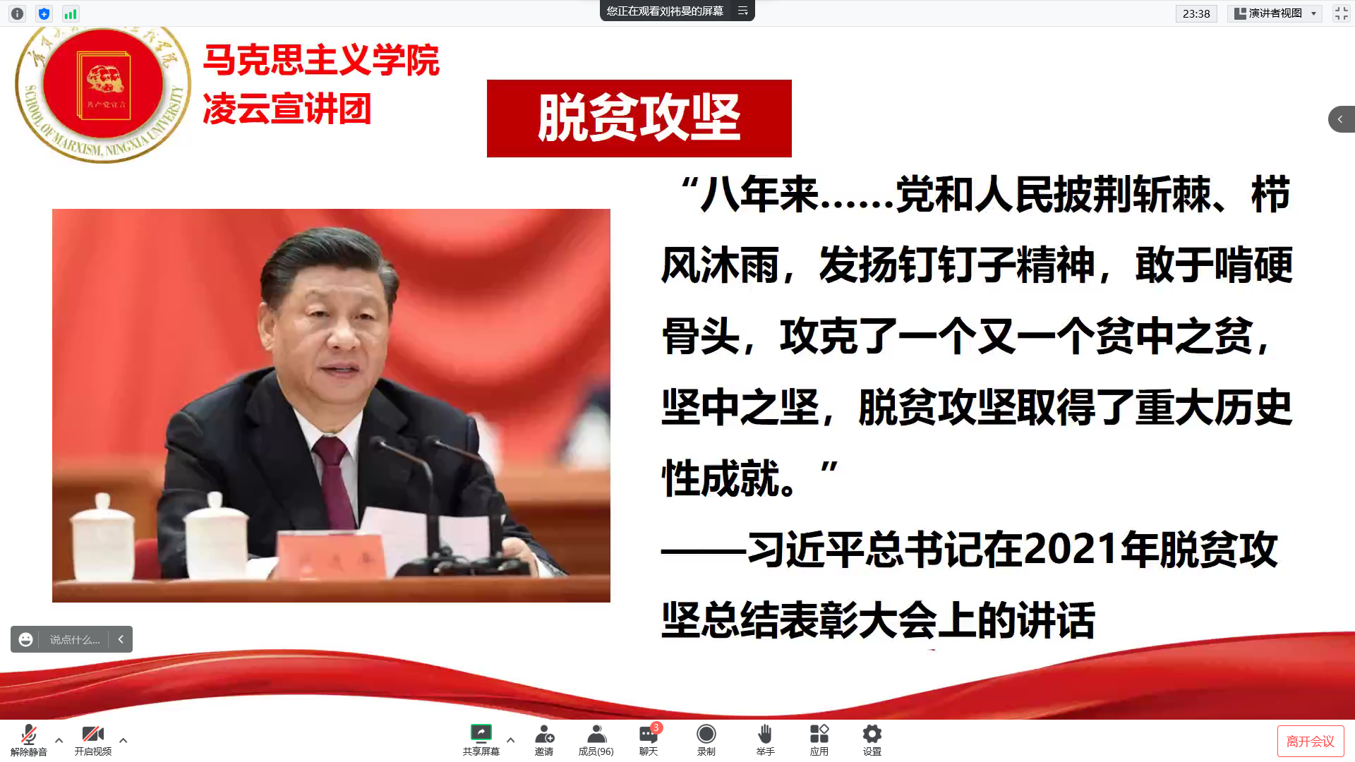宣讲团成员围绕中国共产党人的初心和使命展开讲述,从“使命召唤,初心传承”“追逐初心,苦难辉煌”“初心不忘,梦在前方”三部分阐释了共产党人“不忘初心、牢记使命”的责任与担当。本次宣讲将理论学习与社会实践相结合,帮助同学们深入理解党史,用中华优秀传统文化、革命文化、社会主义先进文化培根铸魂、启智润心,坚定理想信念,勇担青春使命。