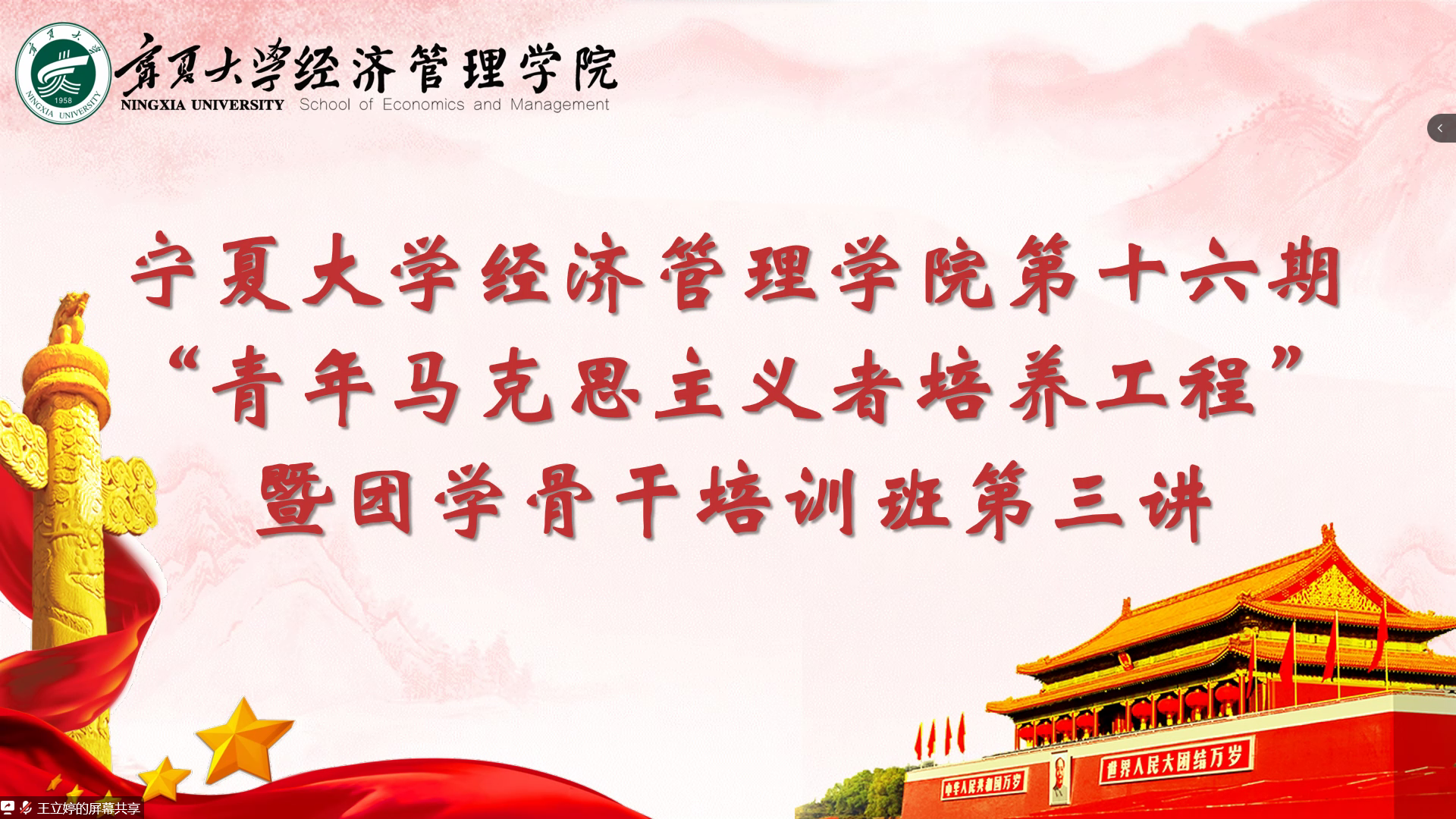 11月18日,williamhill英国(西部发展研究院)第十六期“青年马克思主义者培养工程”暨团学骨干培训班第三讲于线上顺利举行。第十六期青马班成员参加本次培训。本次培训由英国威廉集团马克思主义学院凌云宣讲团成员刘成龙、沙宣、刘祎曼、马明明、潘薇主讲。