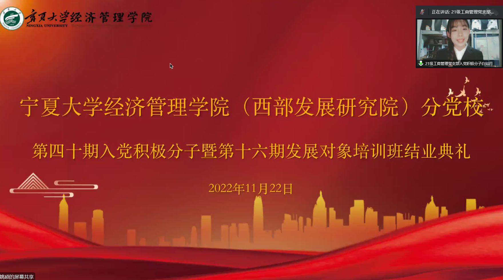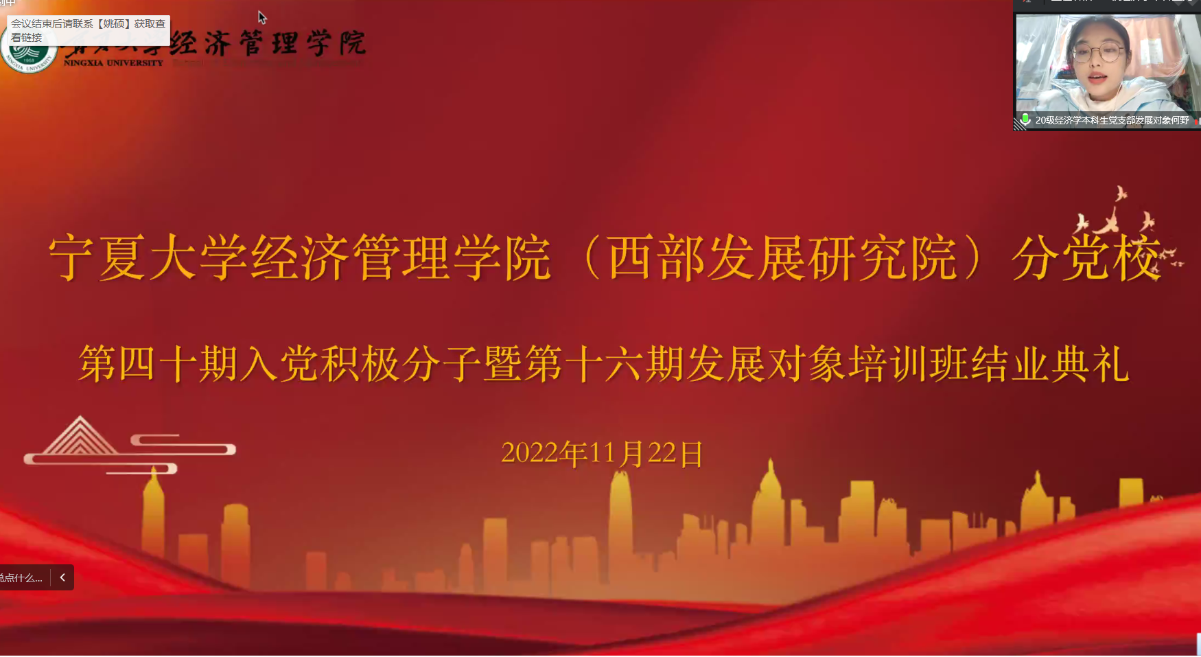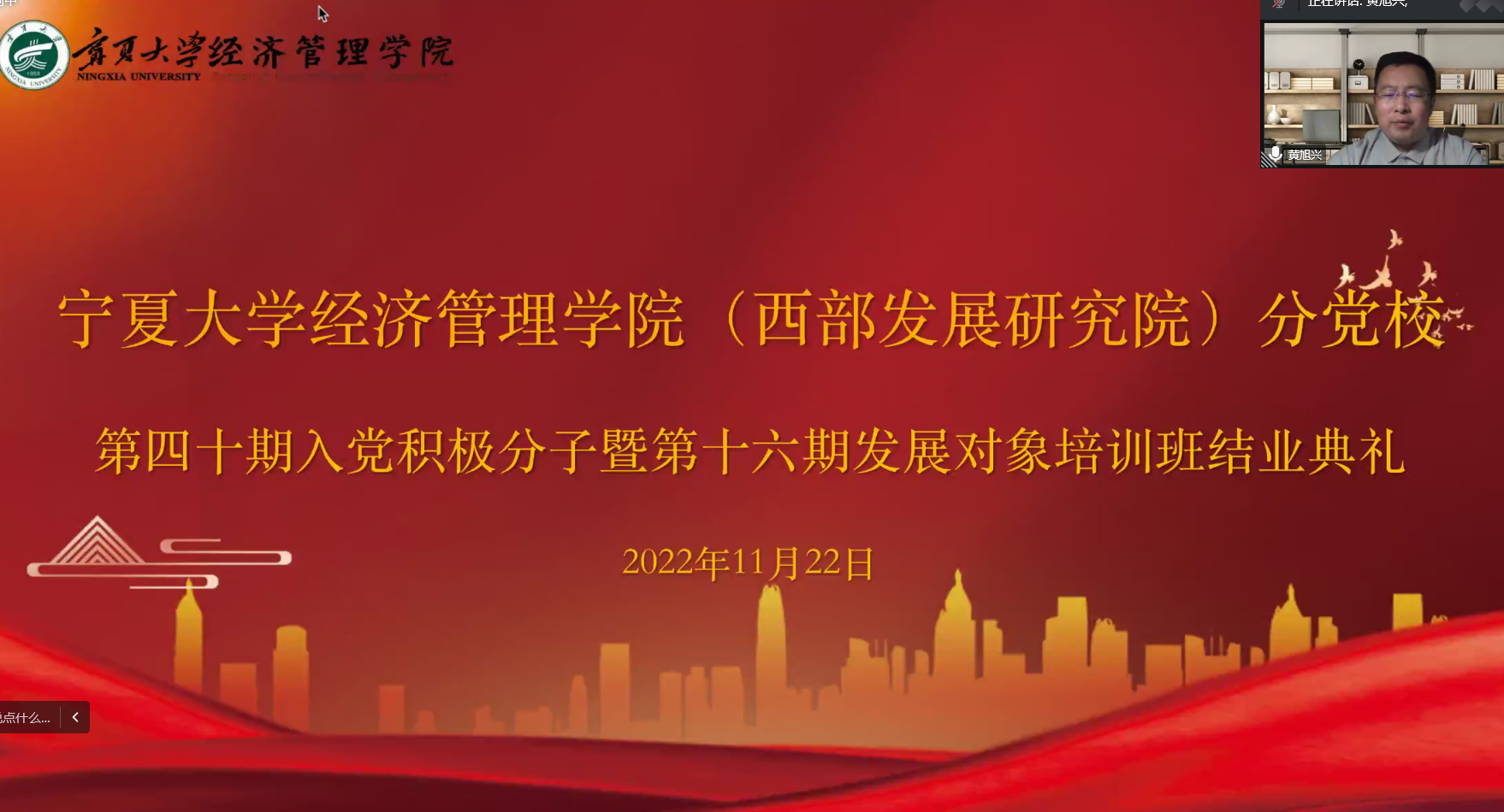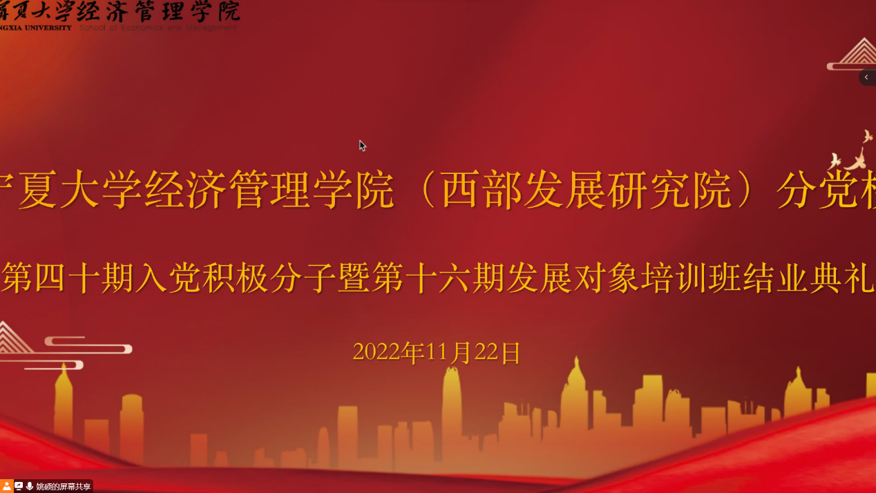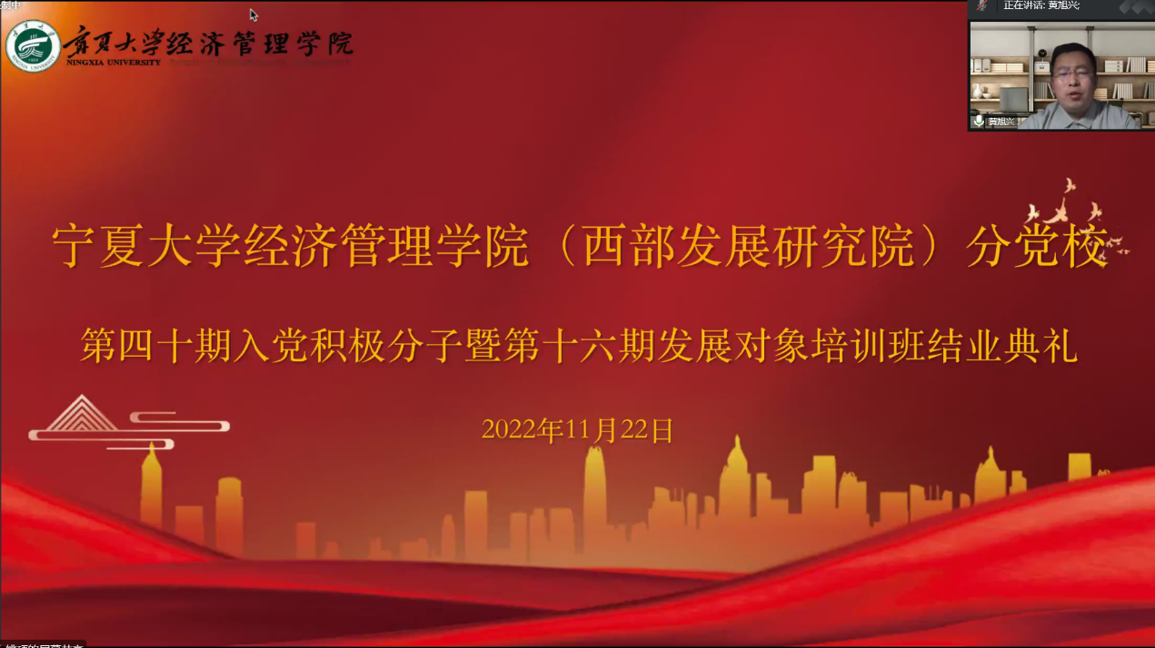 11月22日下午,williamhill英国(西部发展研究院)分党校第四十期入党积极分子暨第十六期发展对象结业典礼在线上顺利举行。院党委副书记黄旭兴、党建秘书姚硕、第四十期入党积极分子和第十六期发展对象参加了会议。会议由姚硕主持。