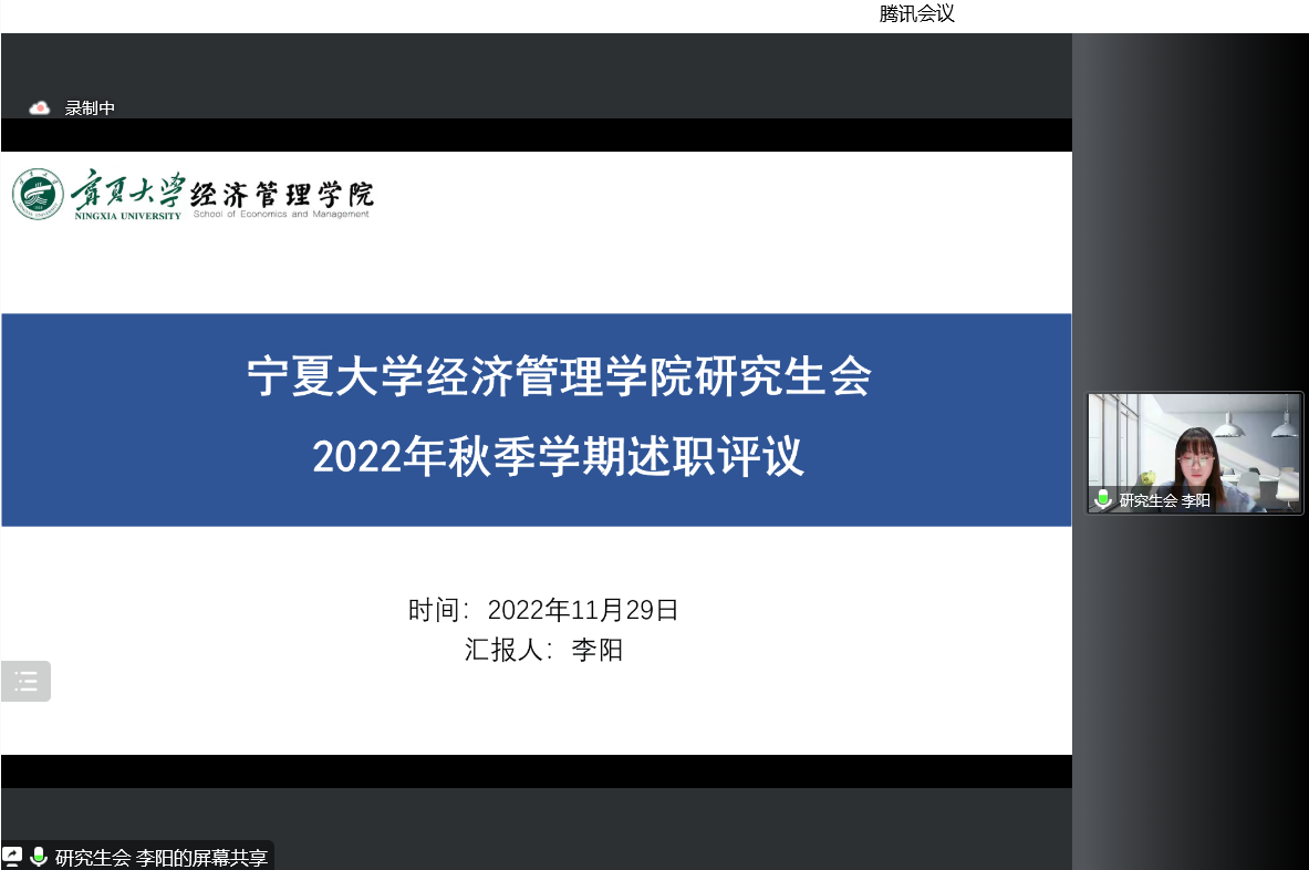李阳代表研究生会主席团做述职报告,她表示研究生会秉持着从同学中来到同学中去,全心全意为同学服务的原则,秉承“经管人生、博学济世”的价值观,不断锻炼自己的能力,发扬奉献精神,彰显青春风采。并从五个方面要求自己,提高自己的思想觉悟和政治修养,坚持在日常生活中为同学们服务,发挥党员的责任与担当,从小事做起,从自身做起,从点滴做起,切实把新思路新想法,新点子等应用于服务学生生活,让研究生会成为让党放心,让学生认可的服务型组织。