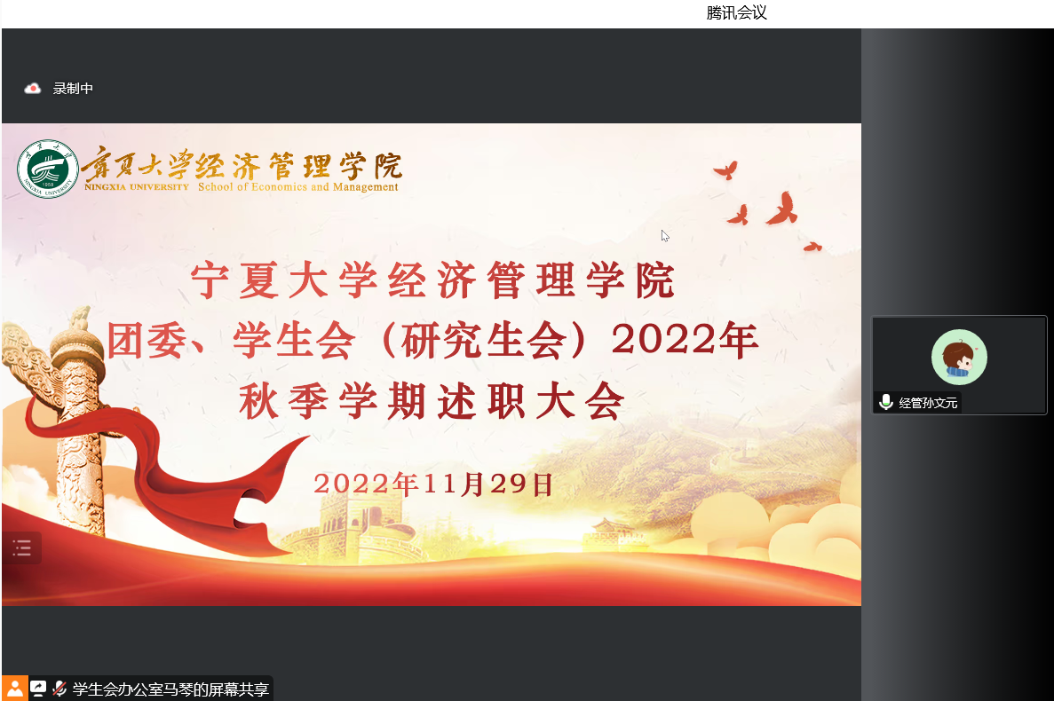 11月29日下午,williamhill英国(西部发展研究院)团委、学生会(研究生会)2022年秋季学期述职大会在线上顺利举行。williamhill英国(西部发展研究院)党委副书记常江、团委副书记孙文元、第十九届一期学生会全体成员和第二十一届研究生会全体成员参加会议。会议由马琴主持。