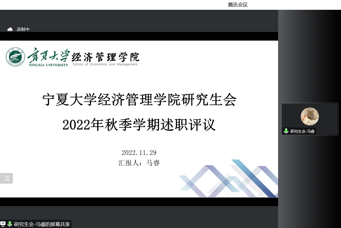 马睿代表研究生会做述职报告。马睿表示我院研究生积极参加各项工作,并配合其他部门开展工作,充分发挥了学生骨干的桥梁和纽带作用,加强了对广大同学的引领并做到了全心全意为同学服务,进一步增强服务同学的责任感和自觉接受监督的意识,有助于研究生会更好的服务同学。